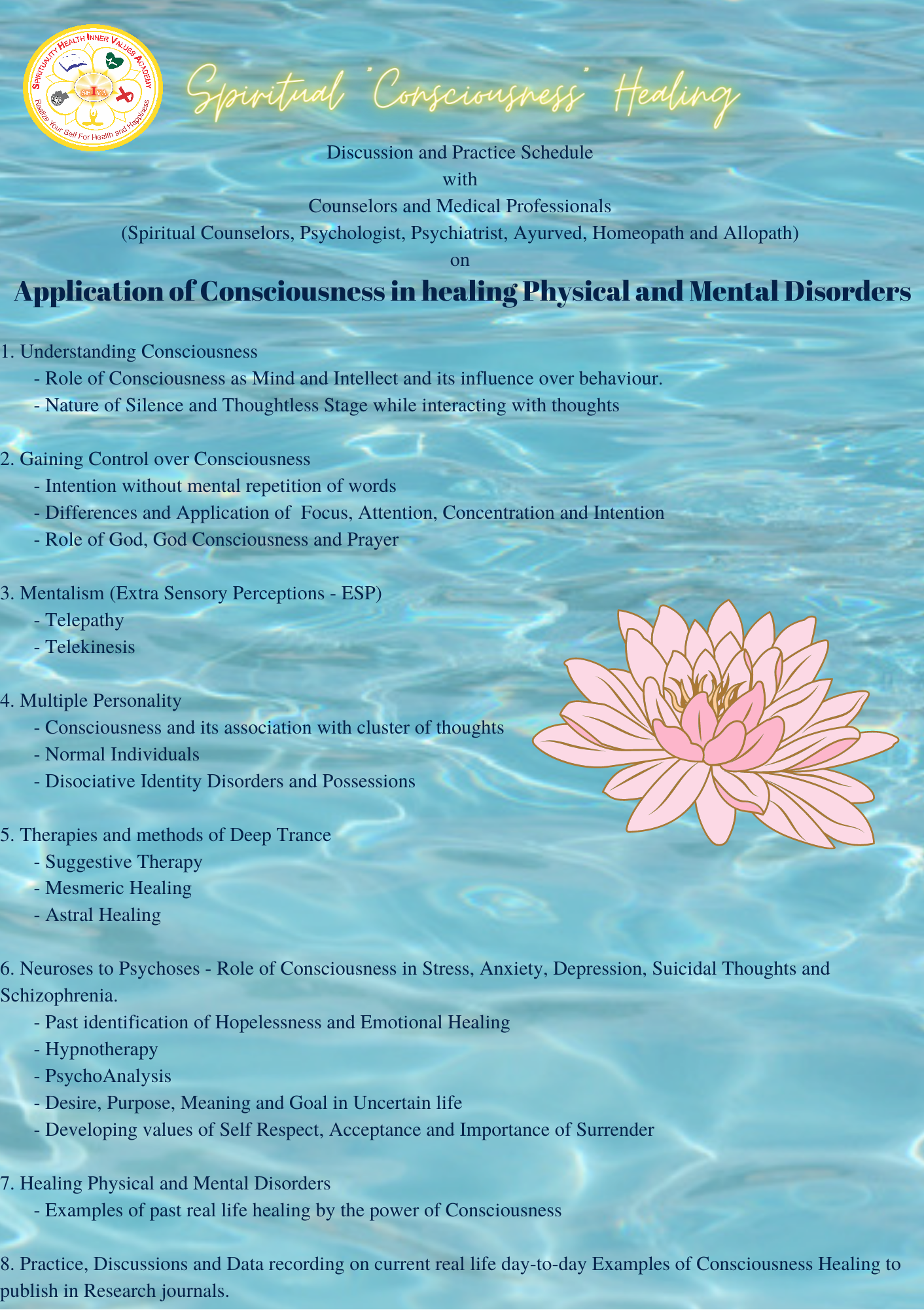 There are regular webinar and discussions on how Consciousness could be explored to deal with physical and mental illness.
